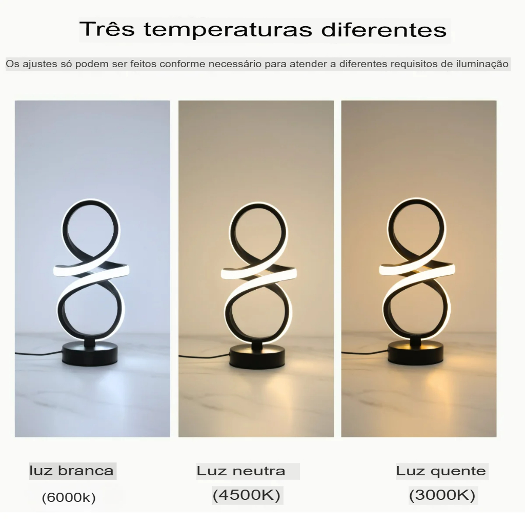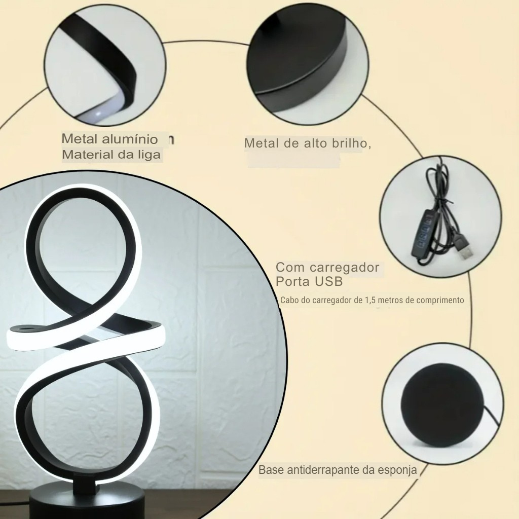 🔄 Estrutura em metal de alto brilho + liga de alumínio com acabamento premium, base antiderrapante, alimentação USB 5V (cabo incluso ~1,5 m) e controle por toque. Conta com 3 temperaturas de luz — branca (6000K) para foco, neutra (4500K) para equilíbrio e quente (3000K) para aconchego. Diferente das luminárias comuns, o formato ♾️ cria um efeito escultórico moderno que valoriza o décor mesmo apagado.