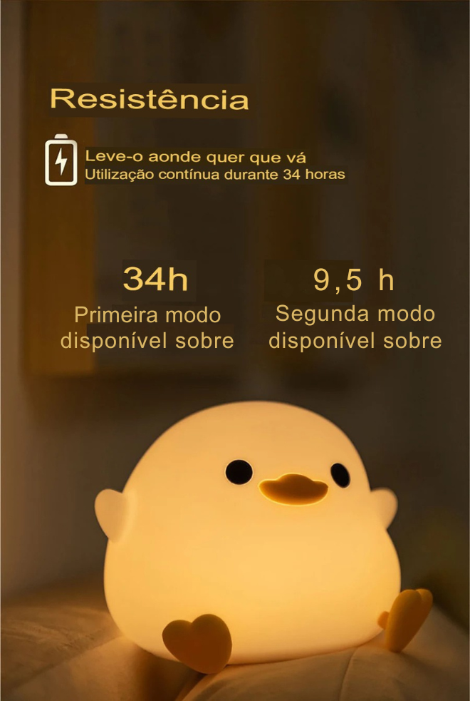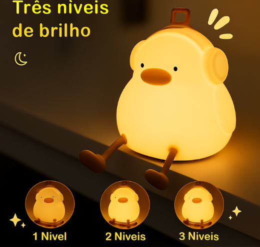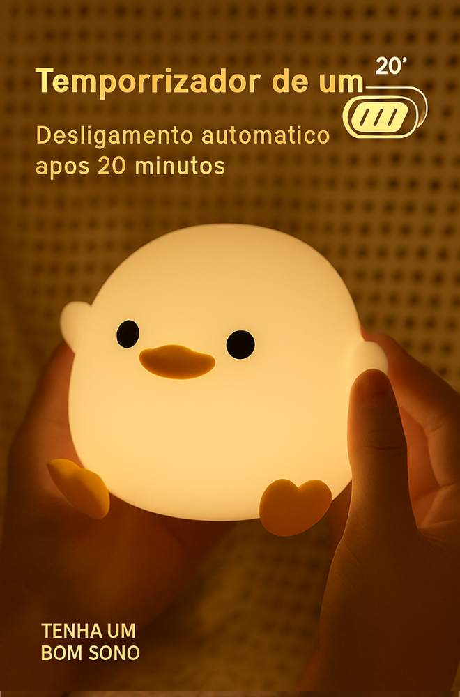 Transforme a rotina noturna em um momento de calma, relaxamento e aconchego. A Luminária Noturna de Pato emite uma luz quente e suave, perfeita para ajudar crianças e adultos a desacelerarem e dormirem com mais facilidade, criando um ambiente que transmite segurança e bem-estar.