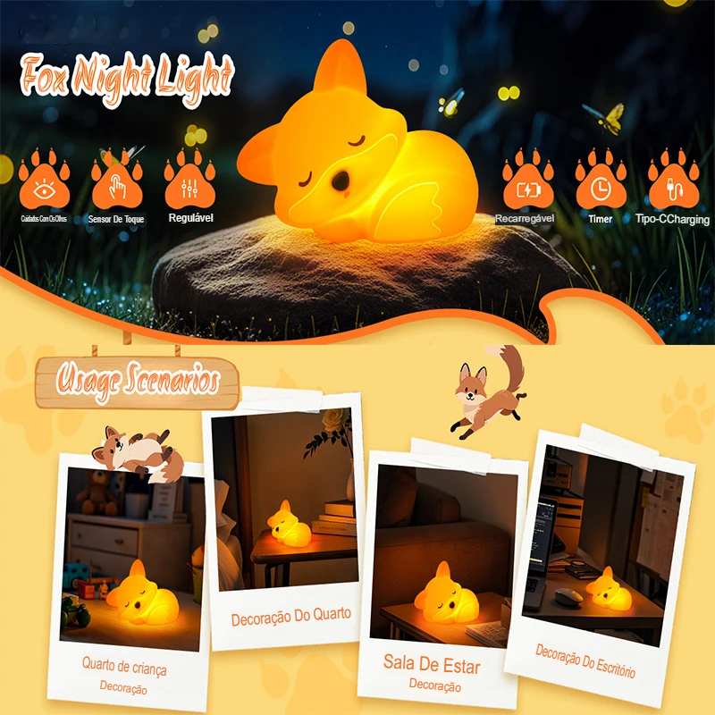 Luz Noturna Raposa Silicone — O Companheiro Macio que Acalma Noites Infantis 🦊🌙