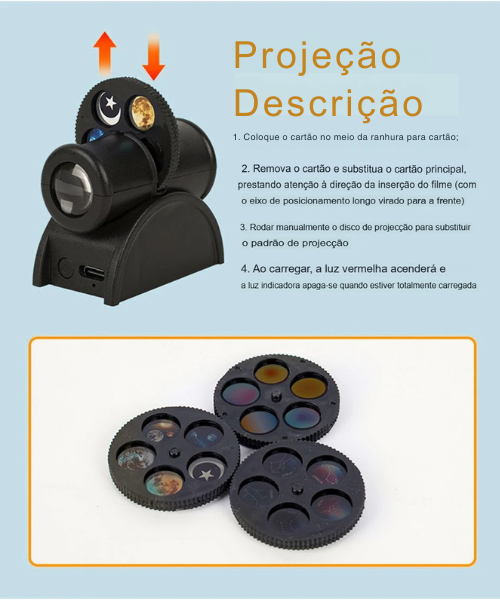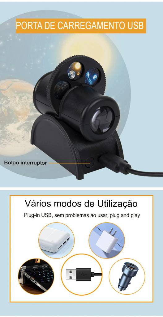 Alimentada por USB, é fácil de transportar e usar em qualquer ambiente. Basta pressionar o botão para ativar a projeção e transformar o espaço instantaneamente.